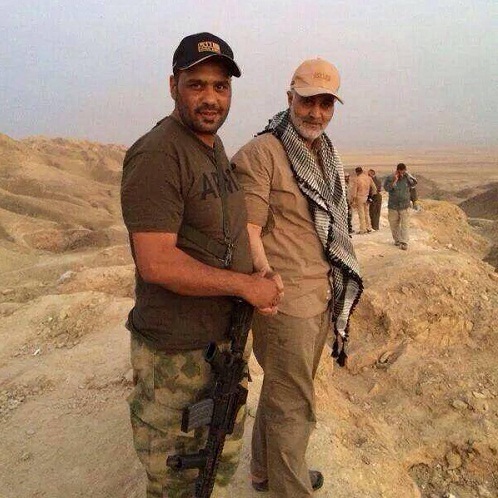 با محاسن سفید، کلاه آفتاب گیر، پیراهن و شلوار خاکی و آستینهای بالا زده؛ سردار قاسم سلیمانی در کنار نیروهای عراقی نماز میخواند، عکس میگیرد و اسلحه به دست در "یزله" و شادی آنها شریک می شود.